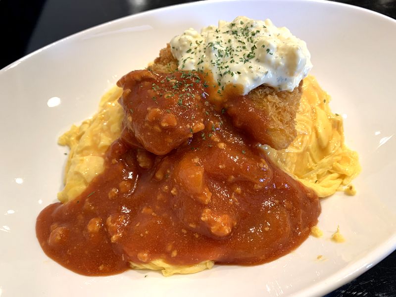 白身魚のフライが2つ乗せられ、その下にはふわトロ玉子。そして自家製トマトソースとタルタルソースがたっぷりかけられていました。