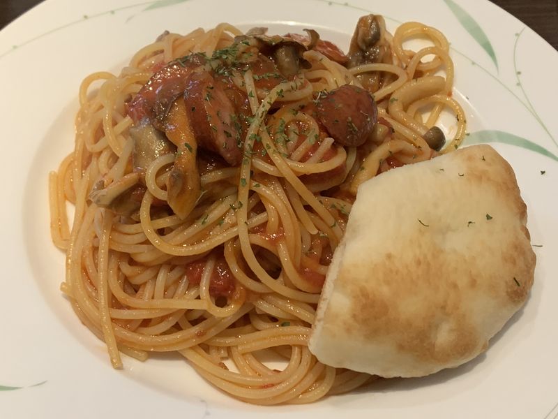 通常カフェめしシリーズではナポリタンを頼むことが多いのですが、この日のパスタは「ソーセージときのこのトマトソース」。