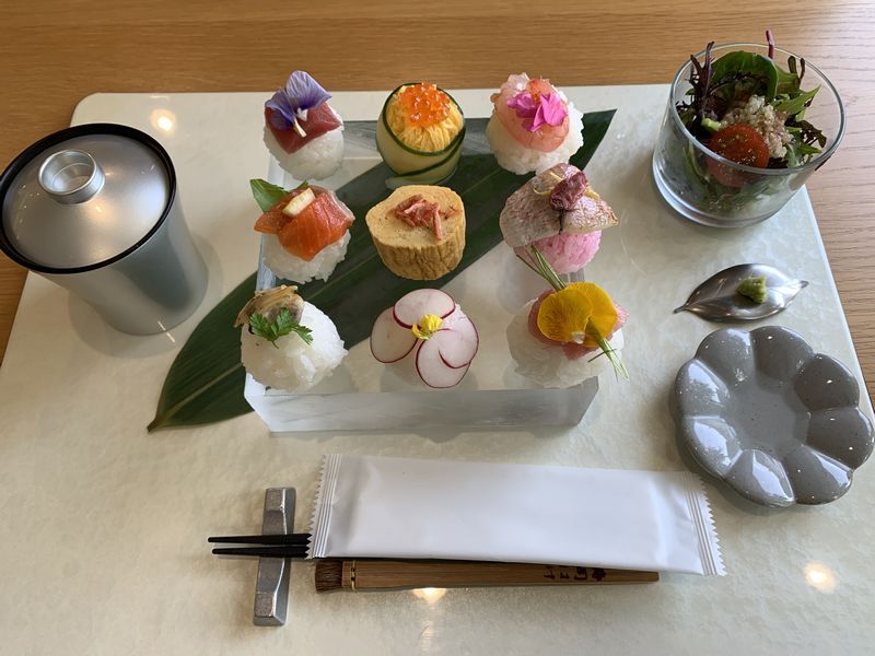手毬寿司が8貫。真ん中にあるのは出汁巻き。乗せられているネタは小さくカットされ見た目重視。またベジフルフラワーが多種使われています。