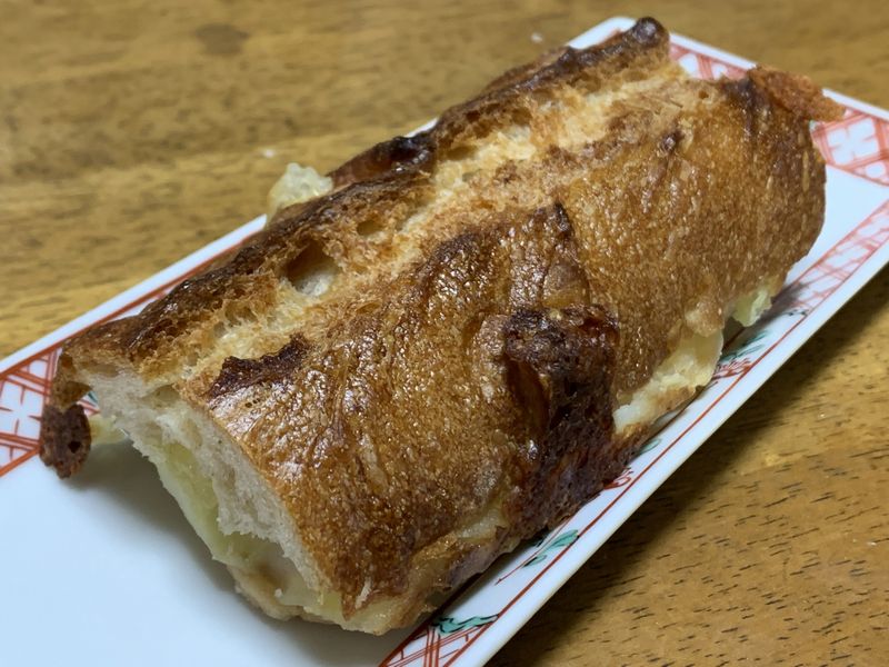 半分にカットするとこんな感じです。ハード系で少し温めて食べるとチーズの濃厚な風味と香ばしい麦の風味を楽しめるパンでした。
