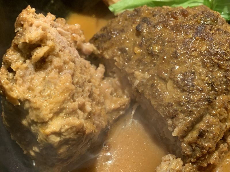 「宗谷岬おくしばーぐ」は、道産牛100%のハンバーグで比較的しっかりと成形されていて食感もしっかりめのハンバーグ。スープカレーと一緒に食べるとうま味が増すような感じでした。
