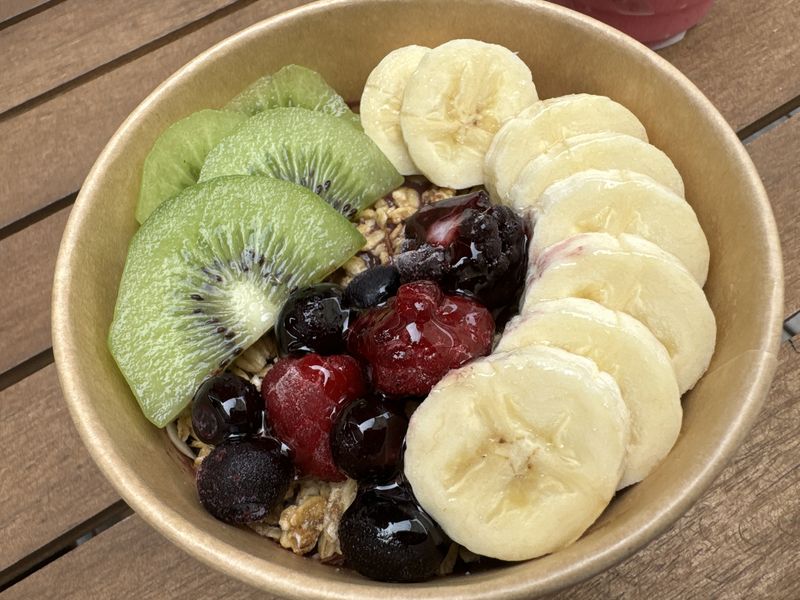 ハワイの定番ヘルシーフード・アサイーに、グラノーラとベリーやバナナなどの果実が並べられ、たっぷりの容量でした。