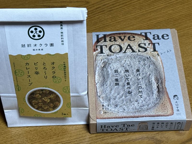 グルメブロガーの私としては買わないわけにはいきません。普段家では食パントーストは食べないのですが、興味がてら買い求めてみました。それと、越前オクラ園の「オクラスープ(カレー)」も買っています。