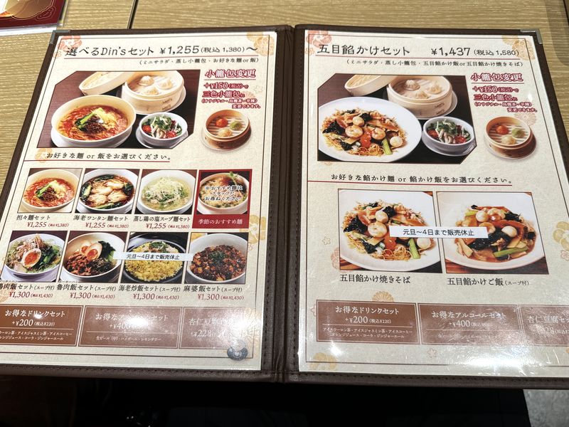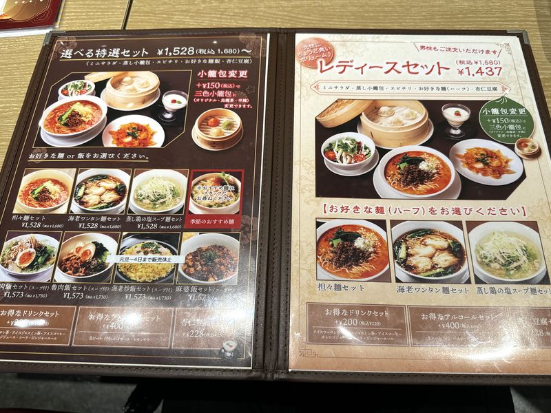 妻と息子は「選べる特選セット」で、麺を期間限定の海老味噌担々麺にしていて、この場合は1,480円でした。ちなみに私の「選べるDin’sセット」との違いはエビチリと杏仁豆腐が付いていないことです。