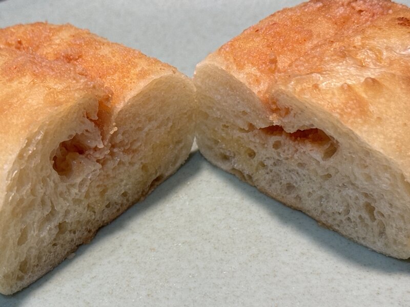 半分にカットするとこんな感じです。バケリは両方ともソフトな食感で小麦の風味を感じました。