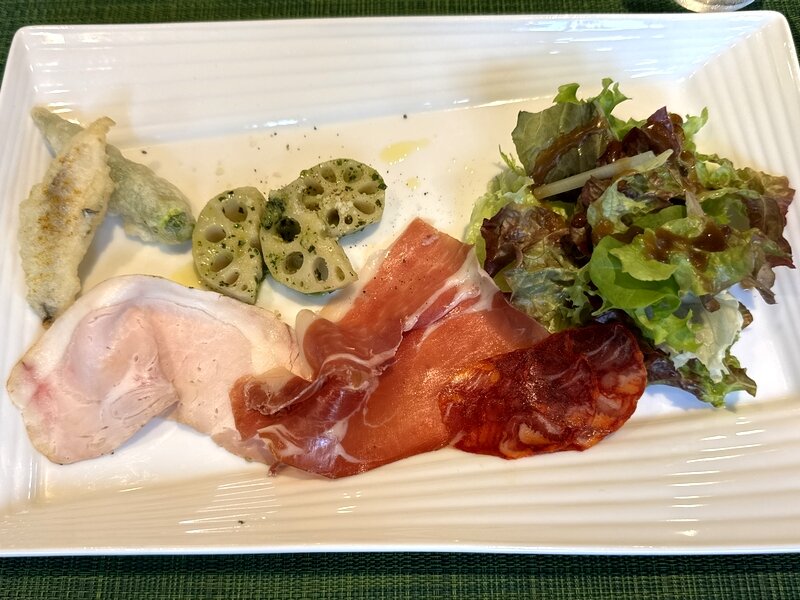 内容はいつも通りグリーンサラダにサラミ・生ハム・ハムと2種類の料理が付いて、料理はフリットと加賀れんこんのバジル和えでした。