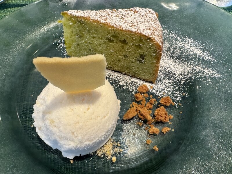 ドルチェは、青森のリンゴを使用した手作りジェラートとピスタチオのケーキ。