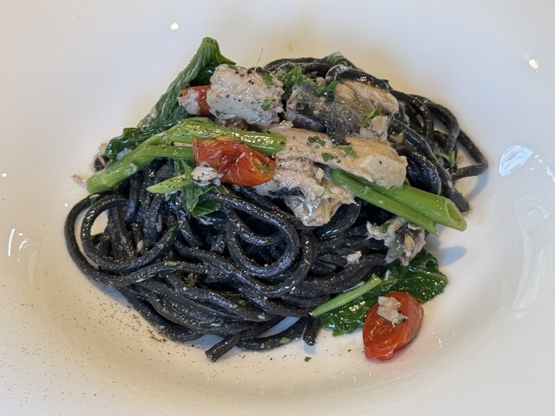 妻は「北海道秋刀魚とセミドライトマトのアーリオオーリオ」を頼んでいて、こちらのパスタのタリオリーニにはイカスミが練りこまれています。