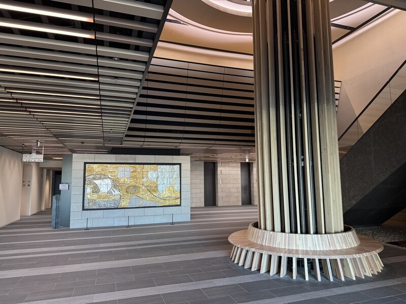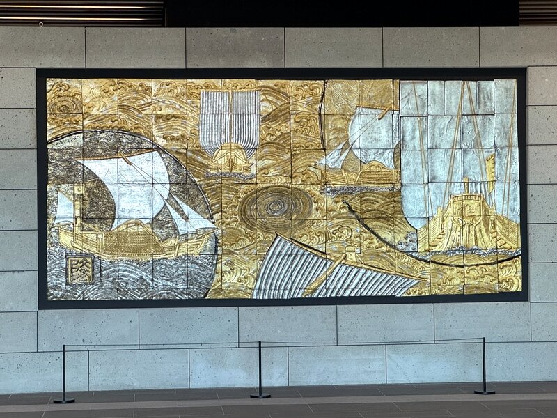エントランスホールには小松市在住の陶芸家 北村隆氏作の北前船をモチーフにした巨大な陶板壁画が来場者を迎えてくれます。
