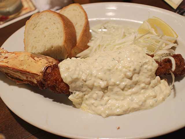 こちらは、巨大な「燻製海老フライ(880円)」。30cmはあろうかという巨大な海老フライだった。有頭の海老を生のまま燻製してから、フライにしているようだ。それは4食限定でグループで1個限りというもの。値段も安いので、早目に行って最初に頼んでおいた方がいいかも?プリプリの海老は食べ応えがあった。