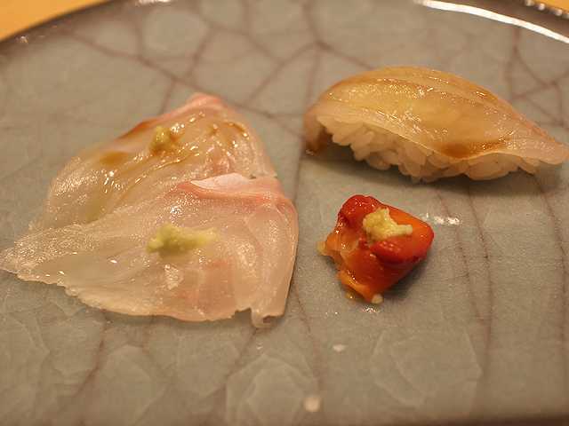 刺身はアラ、赤西貝、そしてキスの昆布締めの小さな握り。昆布締めはほんのりと軽めの〆具合でした。