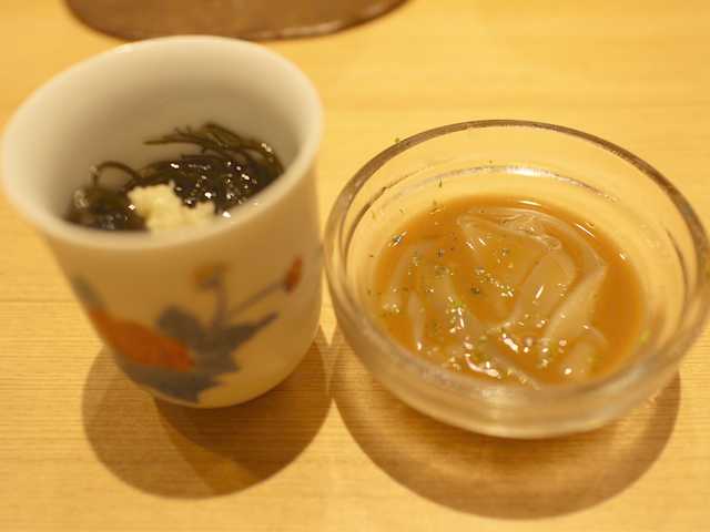 まず出されたのは、イカの赤作りと岩もずく。もずくは能登産でした。イカの赤作りは塩辛ほど辛くなく、ワタの苦みもほどよく酒のアテによかったです。