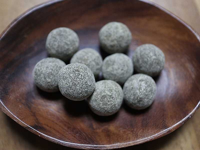 原料である唐辛子と山椒粉、白ごま、黒ごま、けしの実、麻の実、青のりを炒った後、手でもみ込んで香りを引き出していますが、その作業により黒に近づくようです。