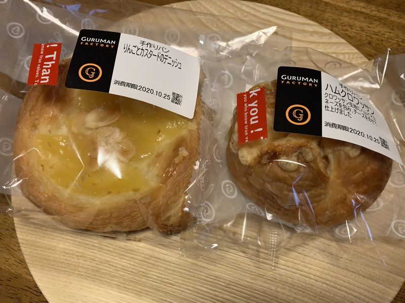 そこで買ったのはこちらの2個。「ハムクロワッサン」と「りんごとカスタードのデニッシュ」です。