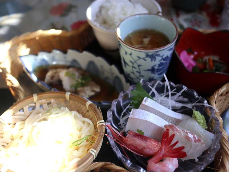 内容はお造り・煮物・小さなうどん・ご飯・茶碗蒸し・漬物。
