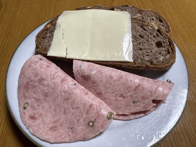 翌朝、能美市のシャルキュトリーのお店「ガリビエ」のハムと、スライスチーズを乗せて食べています。とてもいい組み合わせでおいしくいただくことができました。