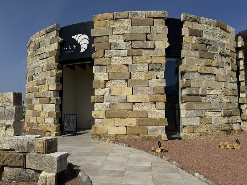 その外観は石積み。「蕎麦 山や」の屋根は福井市足羽山付近で採石される青色系の笏谷石(しゃくだにいし)を使用していましたが、こちらの壁に使われていたのは黄色い軟石(凝灰岩)で、見た限りでは小松市観音下(かながそ)で採れる日華石のような感じです。