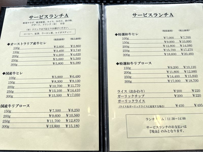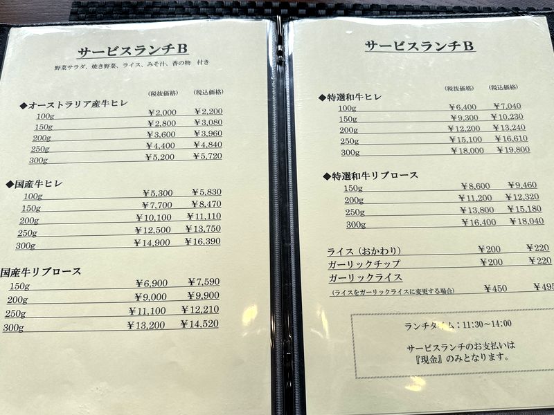 ランチはサービスランチがあって、ドリンクとデザートが付くか付かないか、肉の種類の違いで、あとはグラム数によって値段が違います。