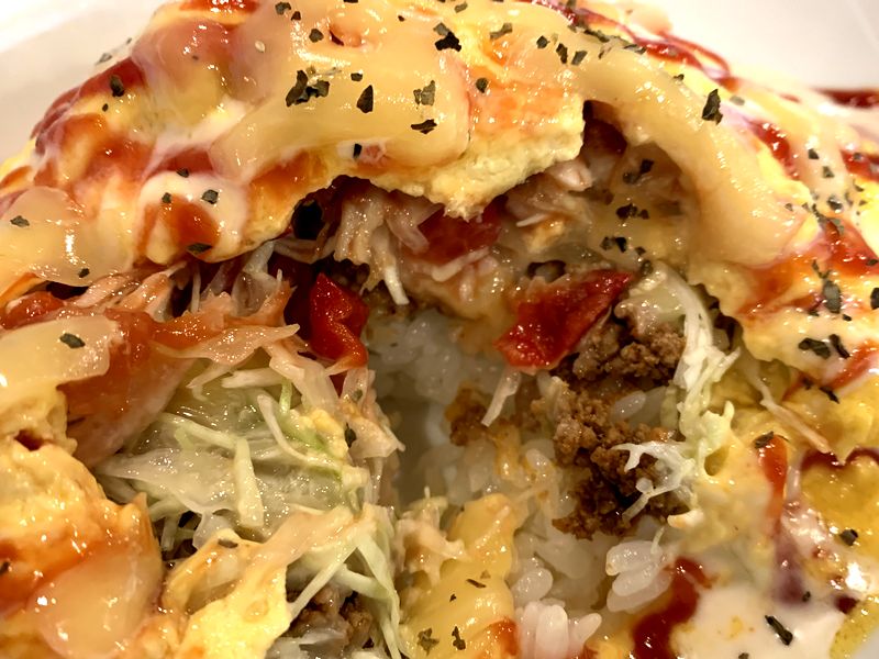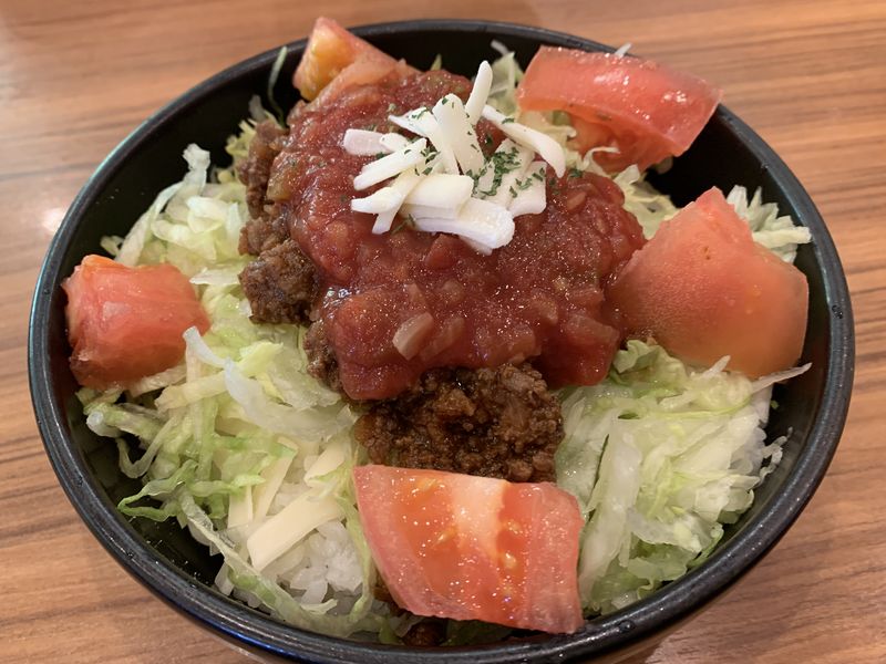 「口福のASA 飯屋」はタイ料理基本のメニュー構成がウリなのですが、「タコライス」は沖縄発祥のメキシコアレンジ料理と言っていいでしょう。たっぷりのひき肉タコミート・レタス・トマト・チーズ。トマトベースのサルサではなく、(からし?)マヨネーズがかけられています。なのでそんなに辛くはないです。