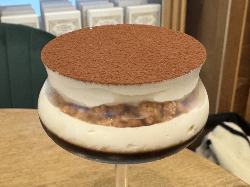 「イタリア産のマスカルポーネを使用したチーズクリームに、マルサラ酒を合わせて、奥行きのある味に仕上げました。ひたひたスポンジの代わりに、コーヒーゼリーとクランブルで食感にアクセントを。甘さとほろ苦さをバランスよくお楽しみいただけます。」ということです。