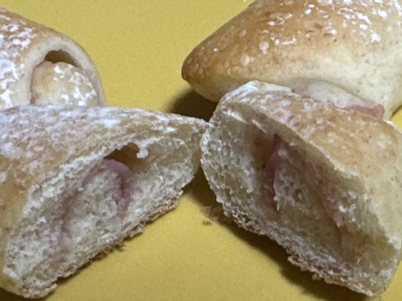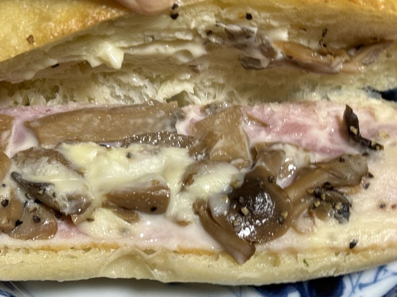 1ヶ月熟成させたこだわりのロースハムとリーフ野菜、ドライトマトマリネ、白カビチーズがサンドされています。