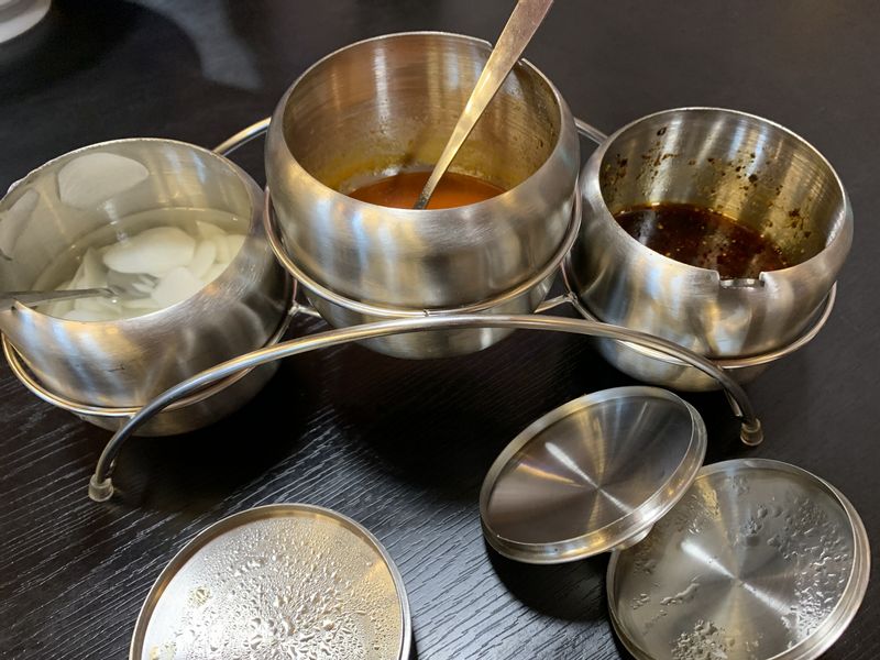 途中でこちらの酢づけ玉ねぎとフォーソースをかけて味変できます。