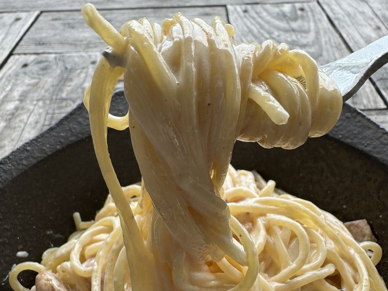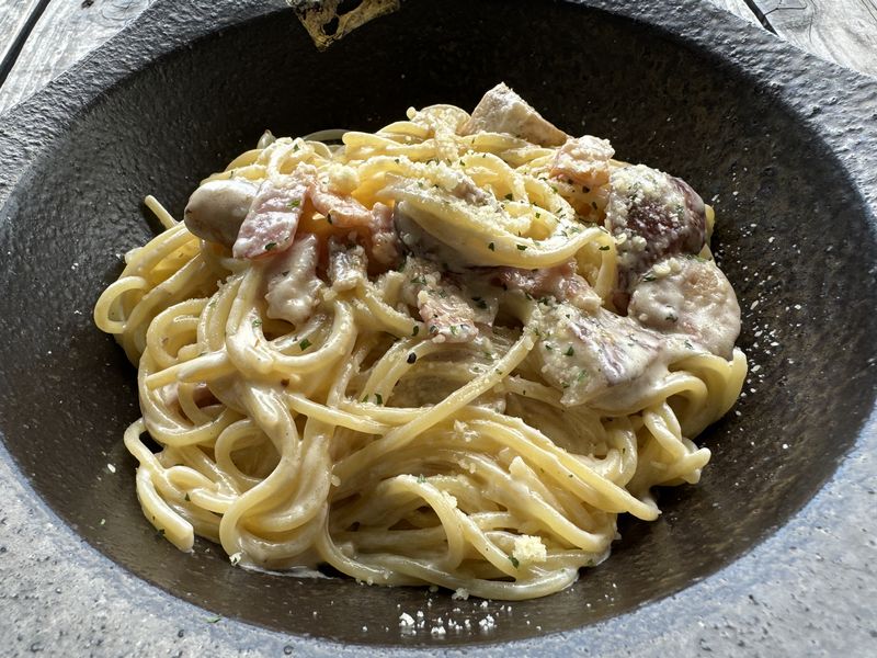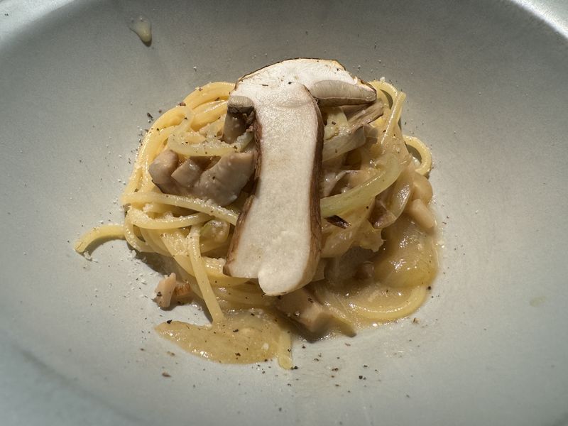 2皿目は温かいバターソースの少しこってり系のフレッシュポルチーニ茸スパゲッティ。