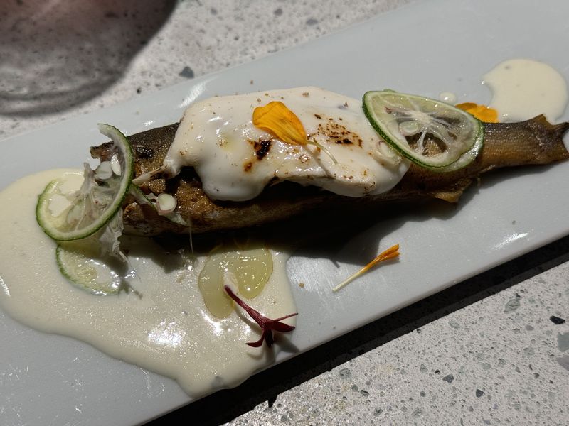 天然鮎は低温でじっくりと燻製されていて、濃厚なソースで食べさせてくれます。もちろん骨まで超柔らかかったです。