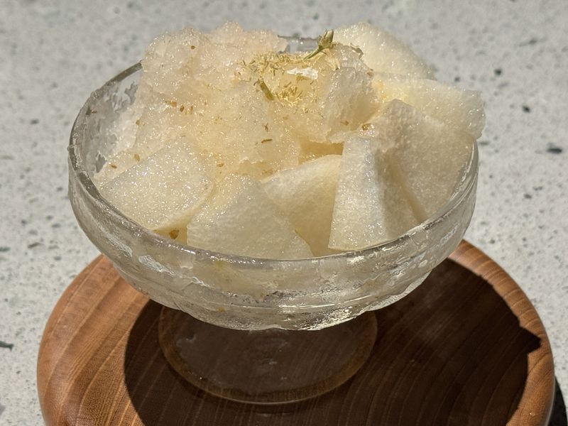 最後のドルチェとして出されたのは「山梨県 鎮目さんの桃」。一応、桃の下はかき氷になっていて、こちらは妻が食べています。