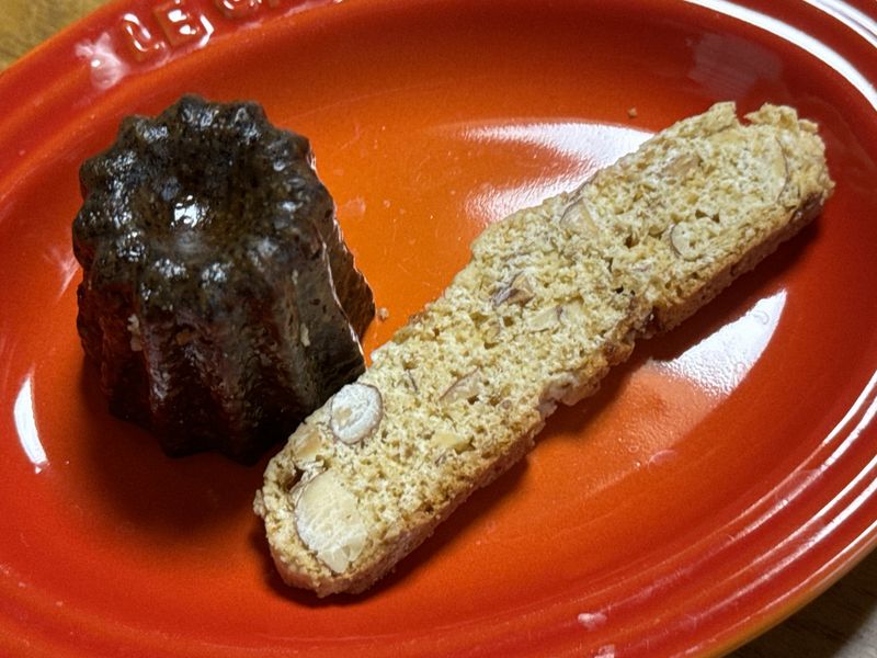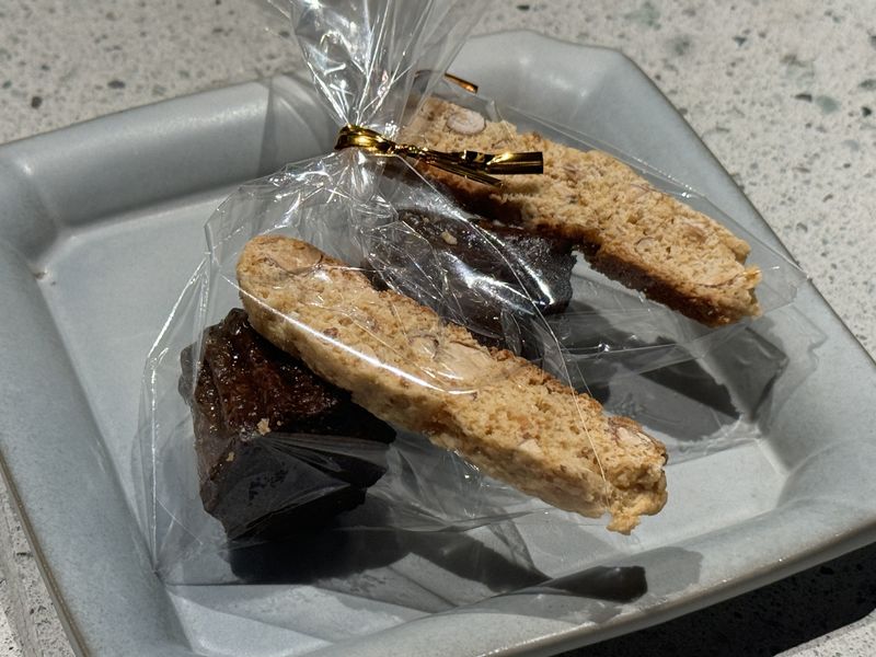 あと、こちらのビスコッティとミニカヌレの小菓子が出されましたが、包装してあるのはお持ち帰りでもokということで、我々はこれまでの料理でお腹が一杯だったので家に持ち帰り翌朝食べています。