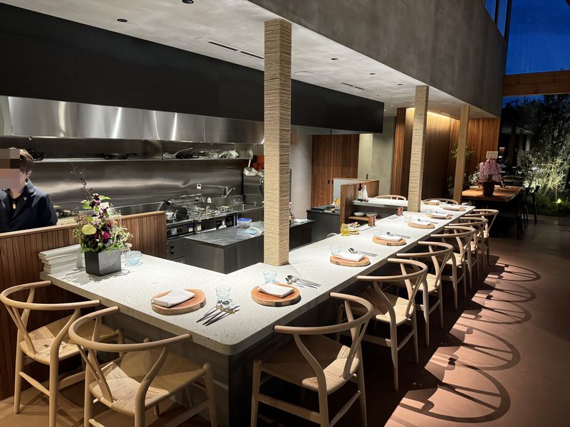 店内に入ると、通路エリアに吹き抜けがあって、オープンキッチンのコの字型カウンター席。奥にはテーブル席がありました。