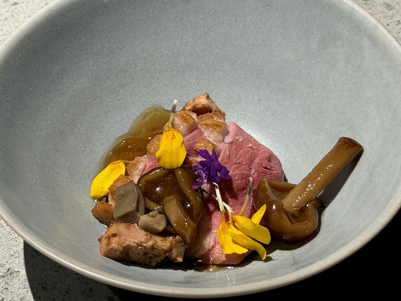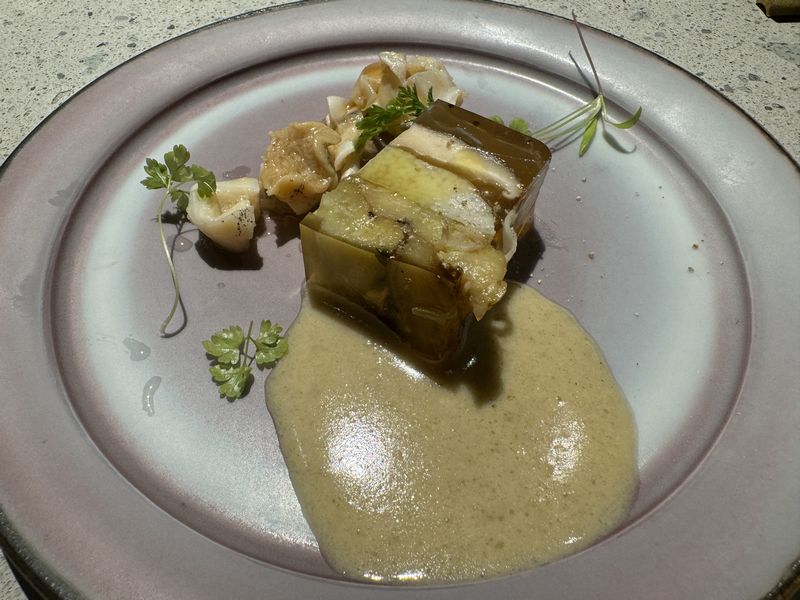もう一皿「北海道産の鴨・白山市木滑の大なめこ・味噌フォアグラ」。和風コンソメだったかな?のジュレで食べさせてくれました。