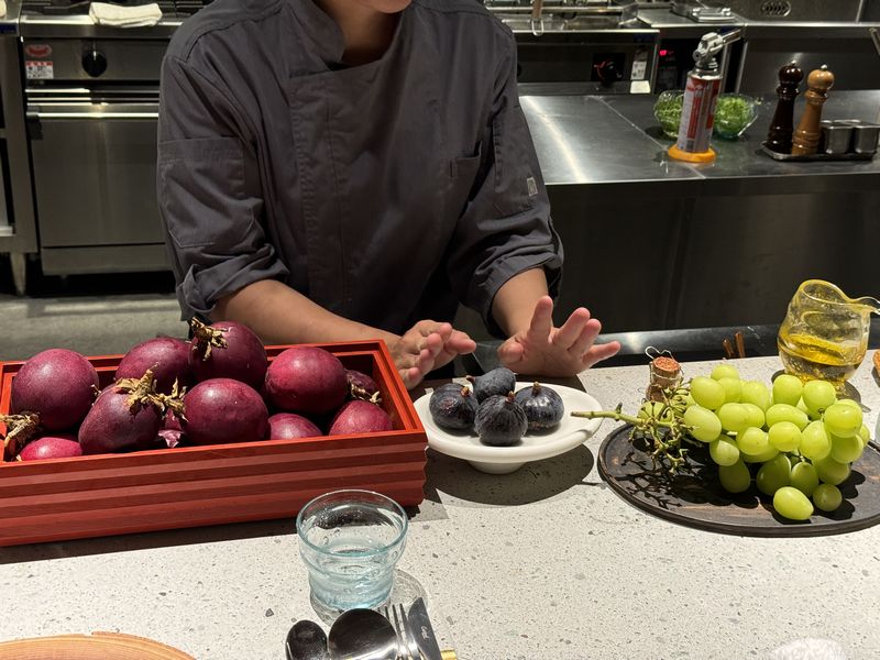 最初に出されたアミューズは、ご覧のような旬のフルーツを使った4品。シェフはフルーツ使いが上手でした。
