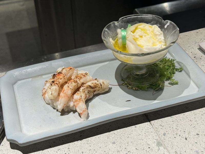 そして、とても甘いシャインマスカットの下には下記のようにブッラータチーズとボタンエビ。