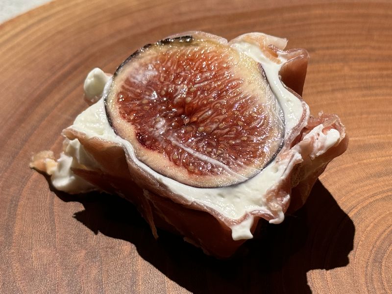 まずは、宝達志水町特産黒いちじく「黒蜜姫」のまわりにマスカルポーネと生ハムを巻いたもの。