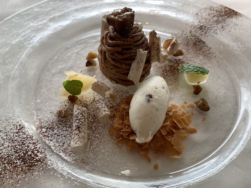デザートは「ノートル・モンブラン~洋なしのコンポートを合わせて ラム・レーズンのアイスクリーム添え」。