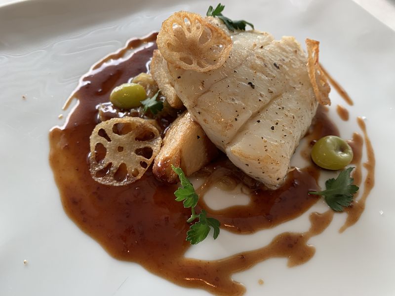 私が魚料理に変えてもらったのが、こちらの「ヒラメのリヨン風ソース」?