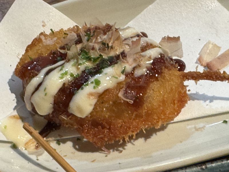 こちらの4つは「厚切りハムカツ(270円)」「海老カマンベール(270円)」「鶏ささみ紫蘇チーズ(250円)」「鶏ももと春タケノコ串(270円)」。
