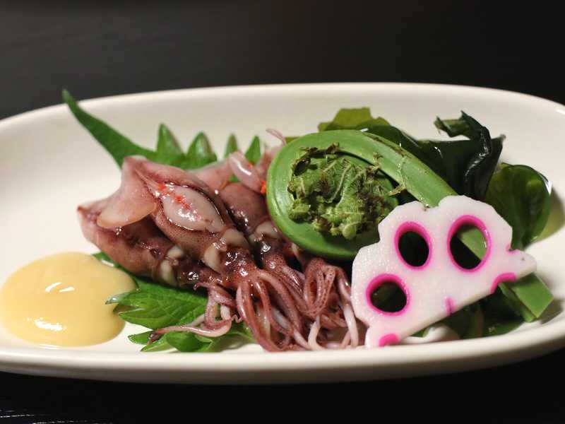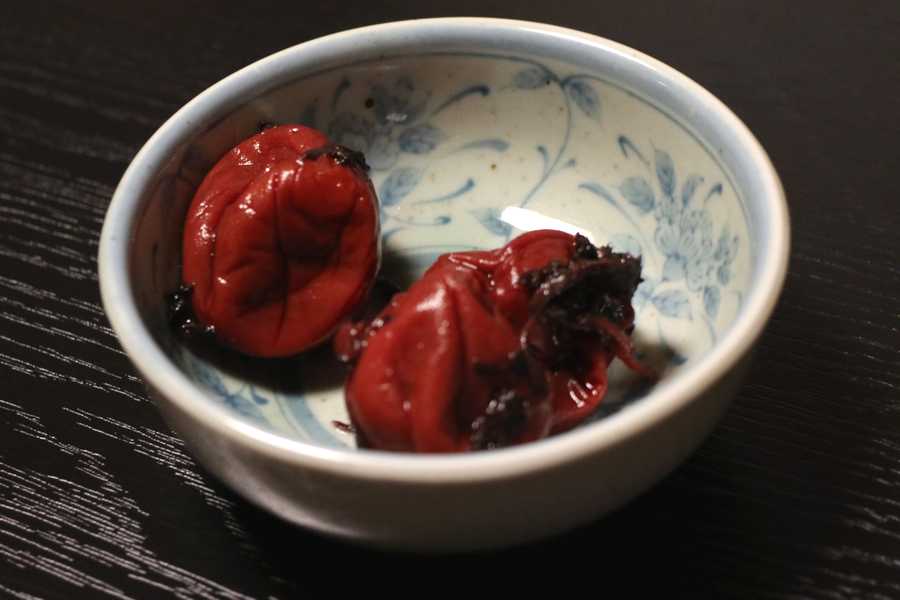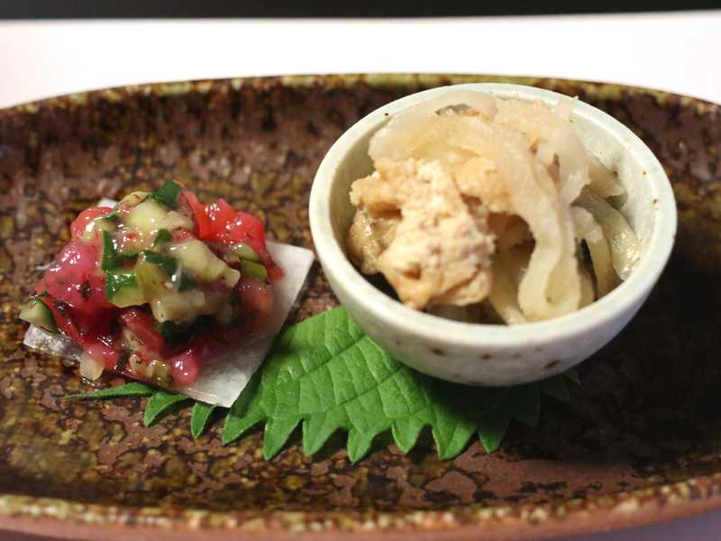 最初に出されたのは新玉ねぎを使って梅の風味で味付けされた先付のようなもの。