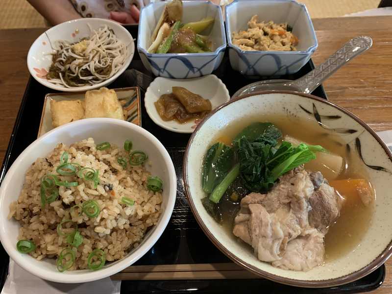 もずくの佃煮、ジーマミ豆腐を天ぷらにしたものなどです。妻は「てぃーらぶい汁膳」で、汁は「骨付き豚あばら肉のソーキ汁」、ご飯は「もずく入りじゅーしー」で内容としては「もずくソーメン」「オクラの油みそ和え」「麩チャンプルー」です。