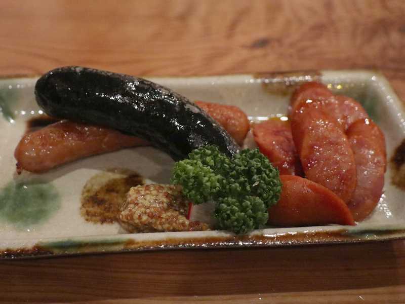沖縄ソーセージの盛り合わせは、沖縄のご当地ソーセージ「ポチギ」と「イカスミソーセージ」そして「アグー豚ソーセージ」の3種類。ポチギは辛口でつまみに最高。そして黒光りしているイカスミソーセージが美味しかったです。