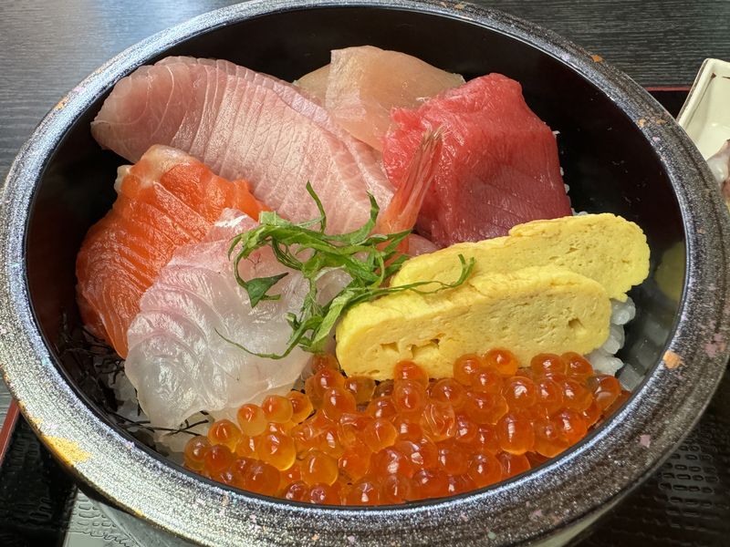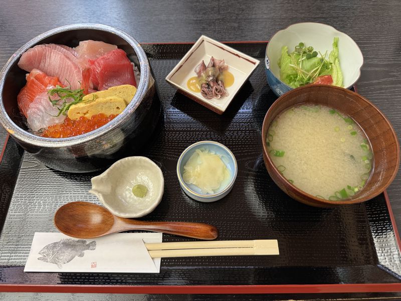 分厚く切られた新鮮な刺身が多くの種類乗せられた海鮮丼で香の物としじみ汁が付いていました。