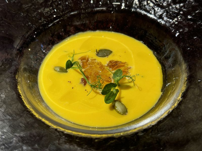 さて料理の方ですが、最初のスープは「香土カボチャの冷製スープ 赤しそジュレ」。