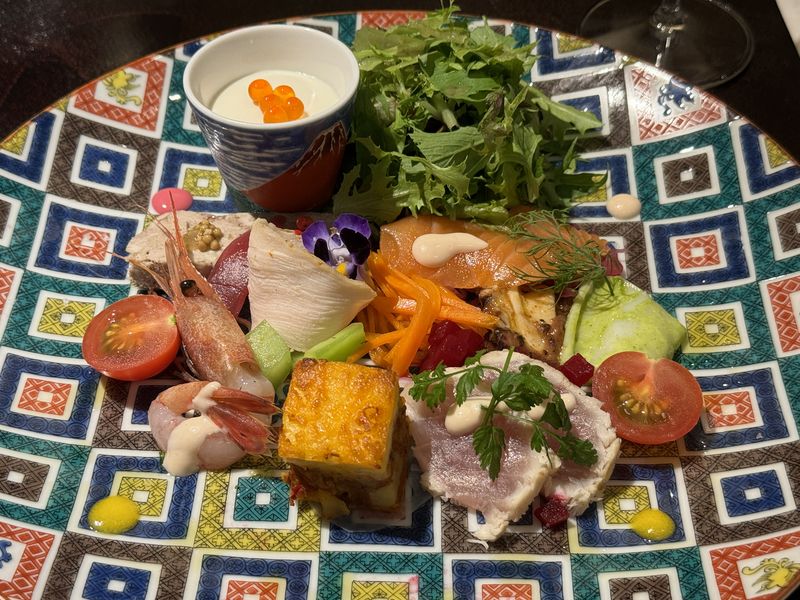 前菜盛り合わせは、九谷焼の大皿に盛られて出されました。鮮やかな柄に負けないほど色とりどりの前菜。