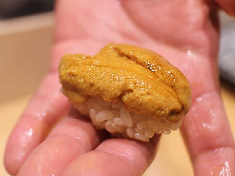 最後はウニですが、珍しくシャリにまぶして手巻きで食べさせてくれます。この食べ方もいいですね。