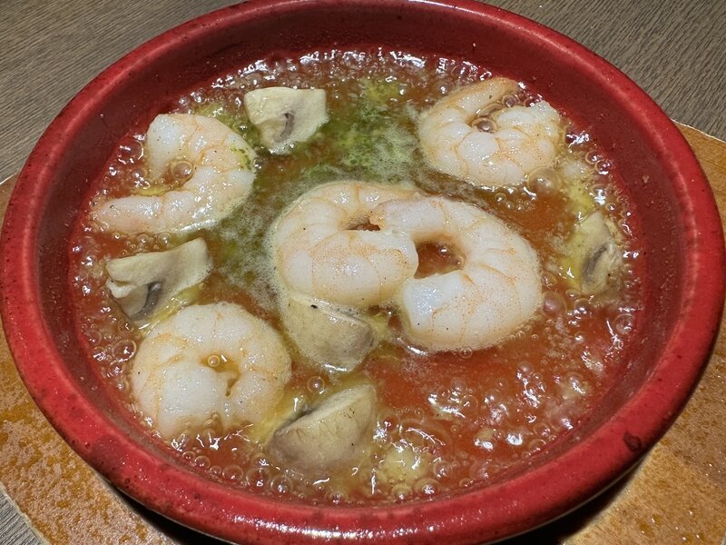 こちらは「エビとマッシュルームのアヒージョ(660円)」。熱々煮えたぎっているのでやけど注意です。