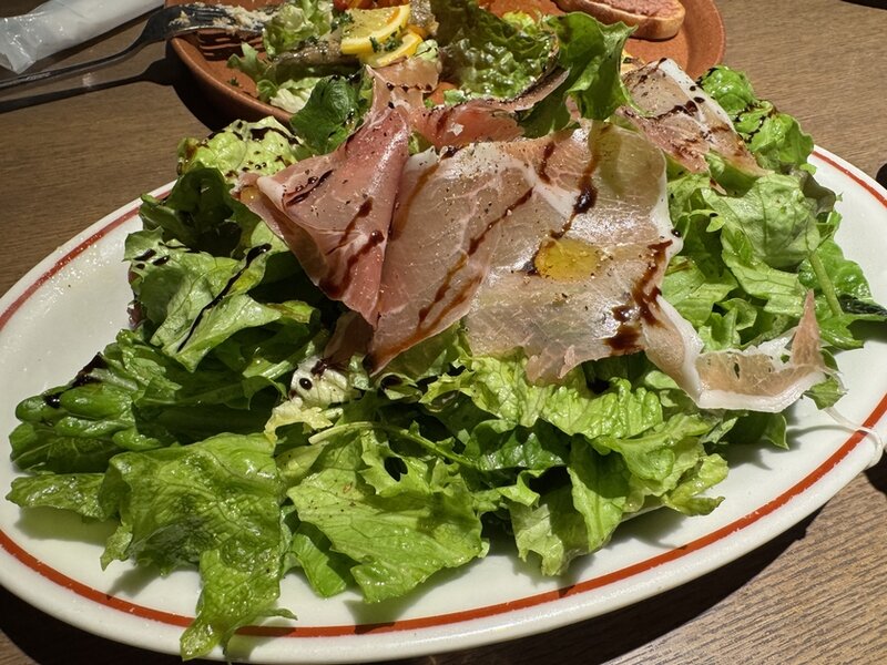 食べ物は最初に「生ハムとルッコラのサラダ(1,200円)」と、