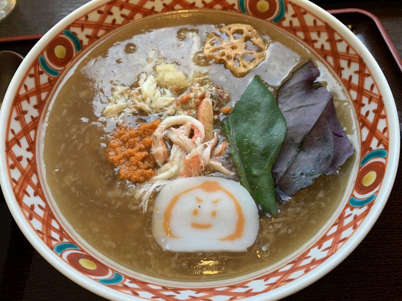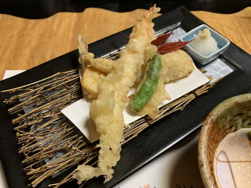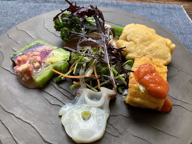 まずは前菜が出されます。見た目も華やか。越前焼の上品なお皿に盛られていました。