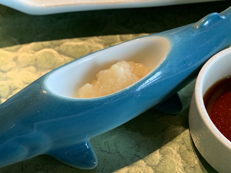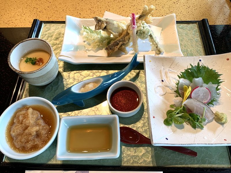天ぷら。若鮎と山菜で、そめおろしで食べます。